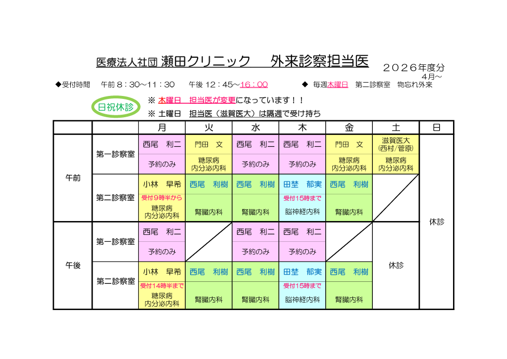 2021年12月01日 毎週水曜日、第1診察室、第2診察室にて診察します。(内科糖尿病専門医1名増えました)